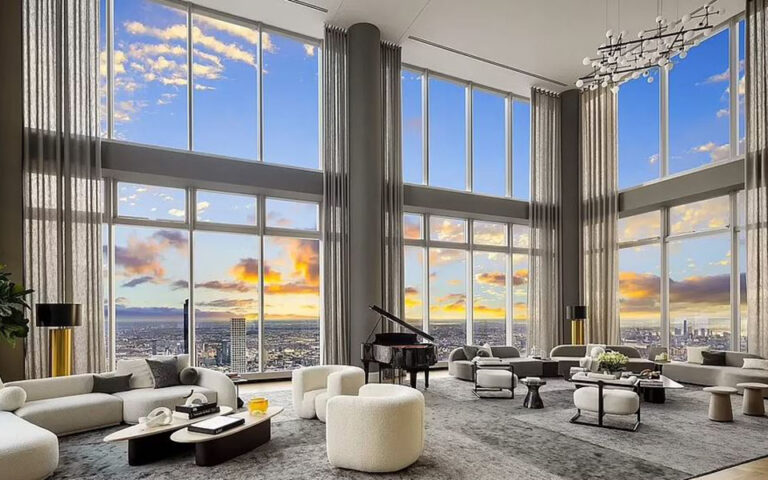 Το εκτεταμένο διαμέρισμα, το οποίο καταλαμβάνει τους τρεις τελευταίους ορόφους του σημαντικότερου κτιρίου των δισεκατομμυριούχων του Μανχάταν, προσφέρει επτά υπνοδωμάτια, οκτώ μπάνια, μαζί με εκπληκτική θέα της πόλης.