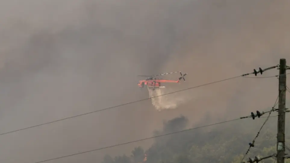Σύμφωνα με την Πυροσβεστική, το μέτωπο της φωτιάς καίει σε δύσβατο σημείο και δεν απειλεί μέχρι τώρα κατοικημένη περιοχή.