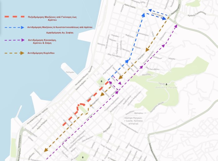 Οι καθυστερήσεις στα έργα ανάπλασης Άνω πόλης και Τριών Ναυάρχων έφεραν ανακατατάξεις στο σχέδιο αλλαγών στην πόλη και των αντιδρομήσεων που θα ξεκινούσαν στο πλαίσιο της παράλληλης πεζοδρόμησης της οδού Μαιζώνος από την Αράτου ως την Γούναρη.