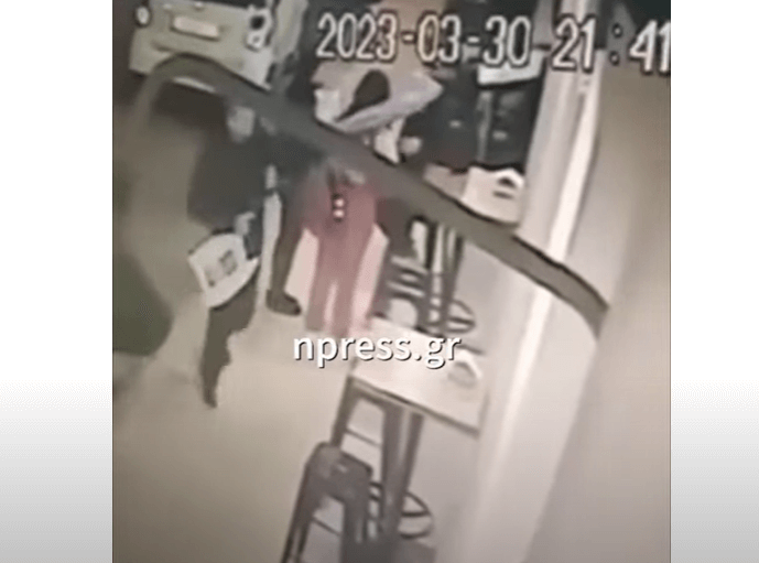 Όταν βρίσκεται απ’ έξω από το μαγαζί, βγάζει την καραμπίνα από την σακούλα και πυροβολεί προς την οροφή του καταστήματος. Μάλιστα ακριβώς δίπλα του, βρίσκονται και κάποιες κοπέλες που τρέχουν έντρομες όταν ακούν τον πυροβολισμό.