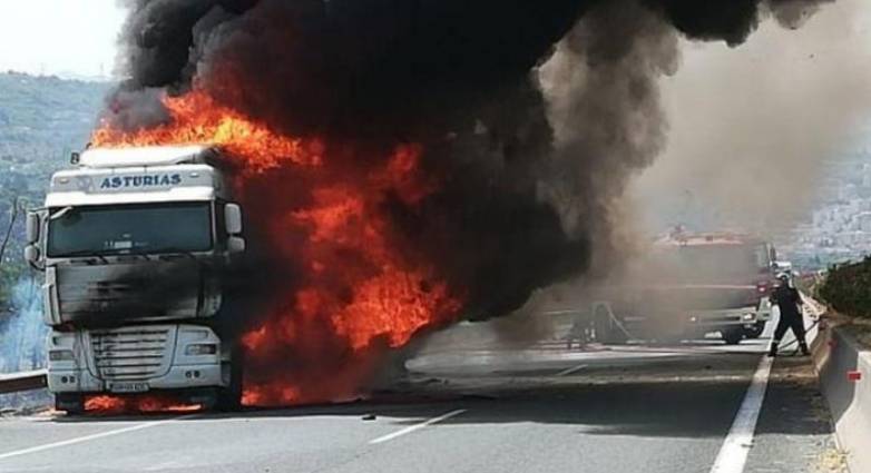 Νωρίτερα, φορτηγό ξέφυγε από την πορεία του για άγνωστο λόγο και τυλίχθηκε στης φλόγες.