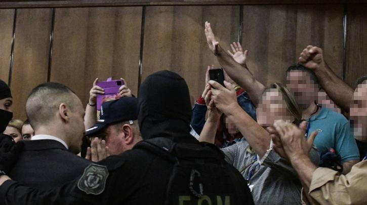 Το στιγμιότυπο αποτυπώθηκε και από φωτορεπόρτερ – Από την αρχή της σημερινής διαδικασίας υπήρχαν καταγγελίες ότι η αστυνομία επέδειξε ανοχή στην παρουσία υποστηρικτών των νεοναζί.