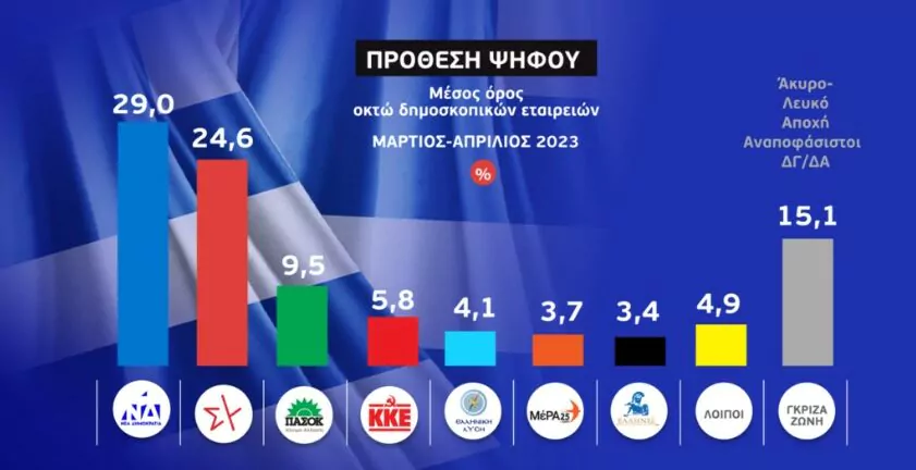 Σύμφωνα με τα δεδομένα που έχουν συγκεντρωθεί από οκτώ εταιρείες, διαφορά 4,4 μονάδων έχει η πρώτη ΝΔ από τον δεύτερο ΣΥΡΙΖΑ.
