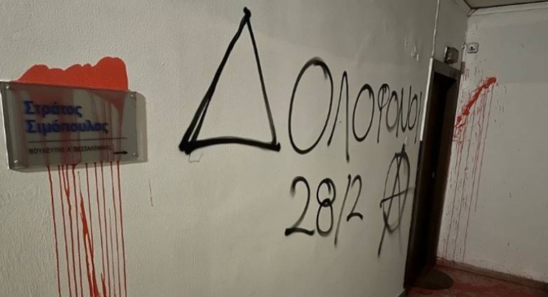 Επίθεση με σπρέι και μπογιές εξαπέλυσαν άγνωστοι έξω από το πολιτικό γραφείο του βουλευτή της ΝΔ Στράτου Σιμόπουλου, στο κέντρο της Θεσσαλονίκης. Όπως ανέφερε ο βουλευτής, οι δράστες έγραψαν στον τοίχο έξω από το γραφείο συνθήματα για το δυστύχημα των Τεμπών.