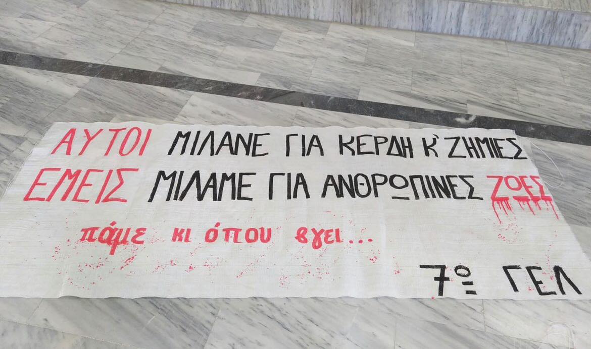 Το πανό που έφτιαξαν και τοποθέτησαν στην κεντρική πύλη του σχολείου τους οι μαθητές και μαθήτριες του 7ου Γενικού Λυκείου της Πάτρας, αναγράφει ένα συγκλονιστικό σύνθημα με το οποίο τα παιδιά αποφάσισαν να πουν το δικό τους μήνυμα για το ασύλληπτο τραγικό δυστύχημα των τρένων στα Τέμπη.