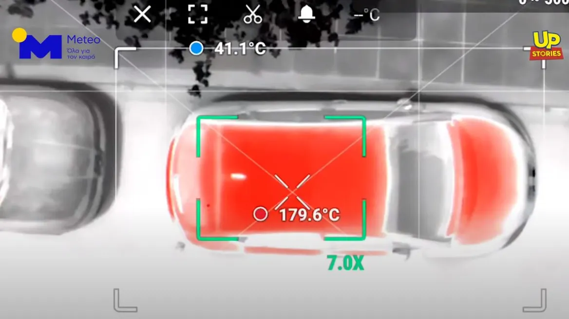 Τις θερμοκρασίες που πιάνει το αυτοκίνητο το οποίο εκτίθεται στον ήλιο εν μέσω καύσωνα και μετατρέπεται σε «παγίδα θανάτου», αποτυπώνεται σε ένα βίντεο συμπαραγωγής του Up Stories με το meteo.gr.