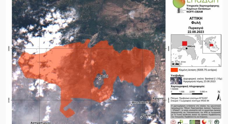 Πιο συγκεκριμένα, στους χάρτες που δημοσιεύει το ΑΠΕ-ΜΠΕ (επισυνάπτονται) φαίνεται ότι οι καμένες εκτάσεις για τις περιοχές Φυλής του Νομού Αττικής και Αλεξανδρούπολης του Νομού Έβρου μέχρι τις 12 μ.μ. (23/08/2023) ανέρχονται στα 50.057 και 617.571 στρέμματα αντίστοιχα. Η χαρτογράφηση πραγματοποιήθηκε με δεδομένα Sentinel-2 (χωρικής διακριτικής ικανότητας 10μ.)