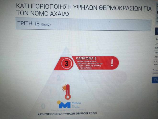 Ενώ η μονάδα METEO του Εθνικού Αστεροσκοπείου Αθηνών έχει κατατάξει την Πάτρα σήμερα Τρίτη στην κατηγορία 3: Ακραίες θερμοκρασίες. Σημαντικός κίνυδνος για την υγεία. Λάβετε τις μέγιστες προφυλάξεις.
