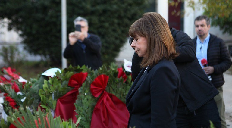 Η Πρόεδρος της Δημοκρατίας έφτασε στο Πολυτεχνείο περίπου στις 08:40 το πρωί της Πέμπτης και κατέθεσε το στεφάνι στο μνημείο χωρίς να κάνει δηλώσεις.