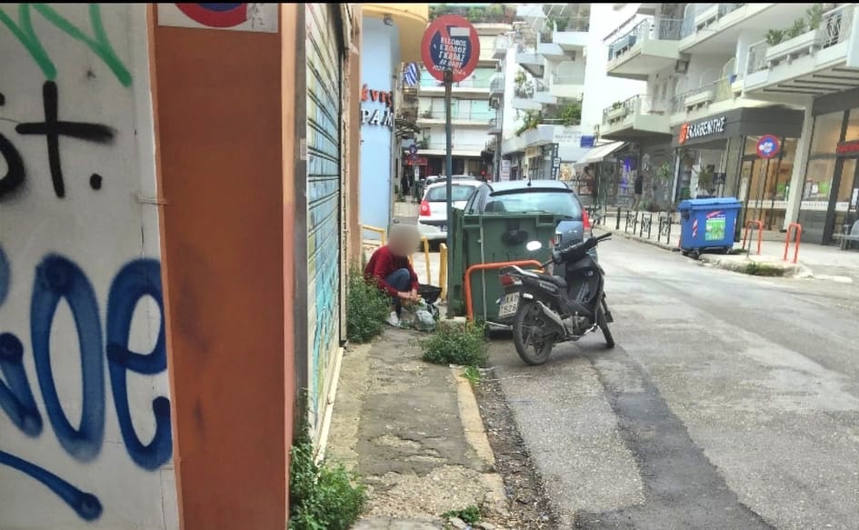 Η νεαρή γυναίκα είχε κρυφτεί πίσω απ’ τους κάδους, άνοιγε σακούλες με σκουπίδια που είχαν πετάξει οι περίοικοι και εξ όσων προλάβαμε να δούμε, έβγαζε από μέσα αποφάγια ή φρούτα και τα τοποθετούσε σε μια άλλη σακούλα.