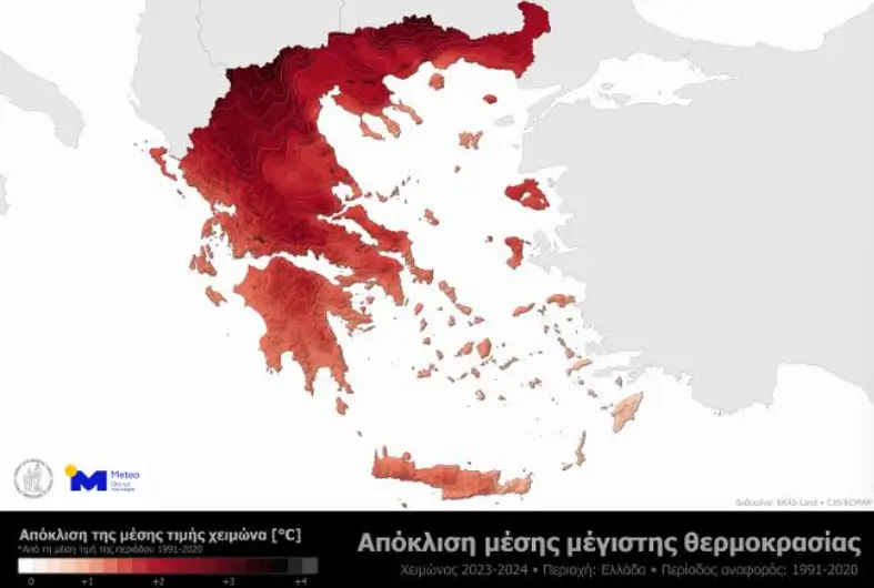 Ο θερμότερος χειμώνας στα χρονικά των καταγραφών για την Ελλάδα είναι ο χειμώνας 2023-2024, σύμφωνα με τα προκαταρκτικά δεδομένα της υπηρεσίας κλιματικής αλλαγής (C3S) του Ευρωπαϊκού προγράμματος Copernicus, τα οποία τα οποία ανέλυσε η επιστημονική ομάδα του meteo.gr/Ε.Α.Α και παρουσιάζονται σε άρθρο των Γ. Κύρου, Σ. Ντάφη και Κ. Λαγουβάρδου.