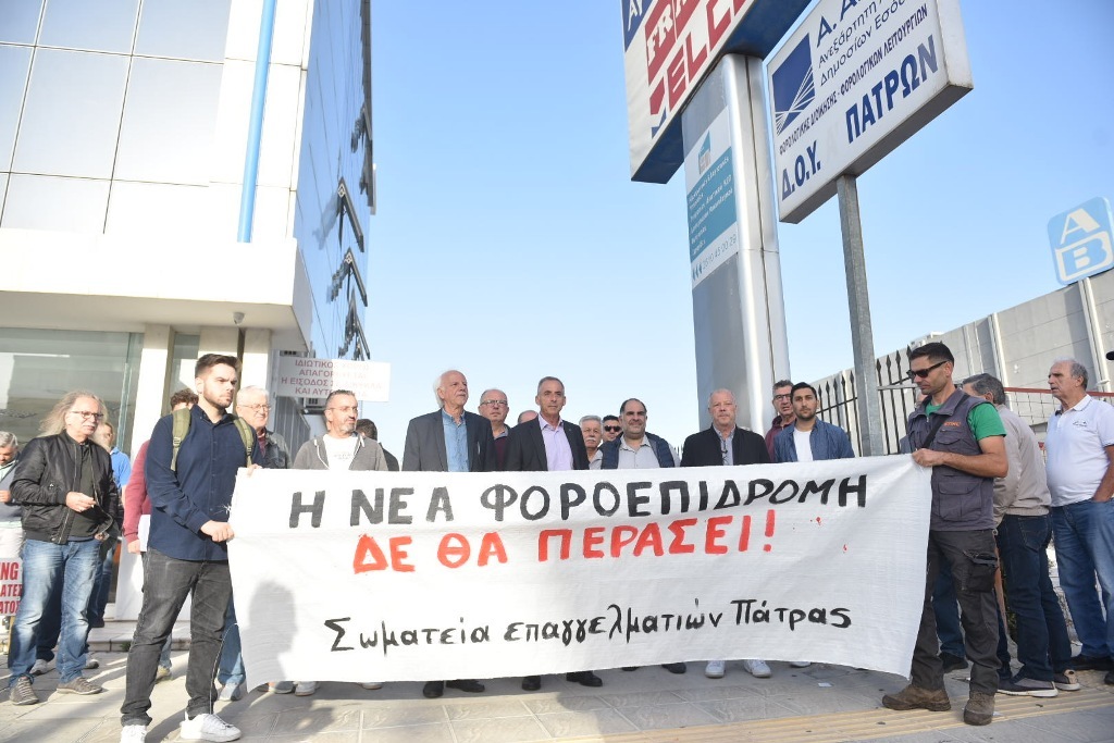 Σωματεία και Σύλλογοι Επαγγελματιών και Αυτοαπασχολουμένων της Πάτρας, μεταξύ των οποίων η ΟΕΒΕΣΝΑ, ο Εμπορικός Σύλλογος και ο ΣΚΕΑΝΑ, πραγματοποίησαν σήμερα το πρωί παράσταση διαμαρτυρίας, έξω από την Δ.Ο.Υ. Πατρών, για το νέο φορολογικό νομοσχέδιο της κυβέρνησης.
