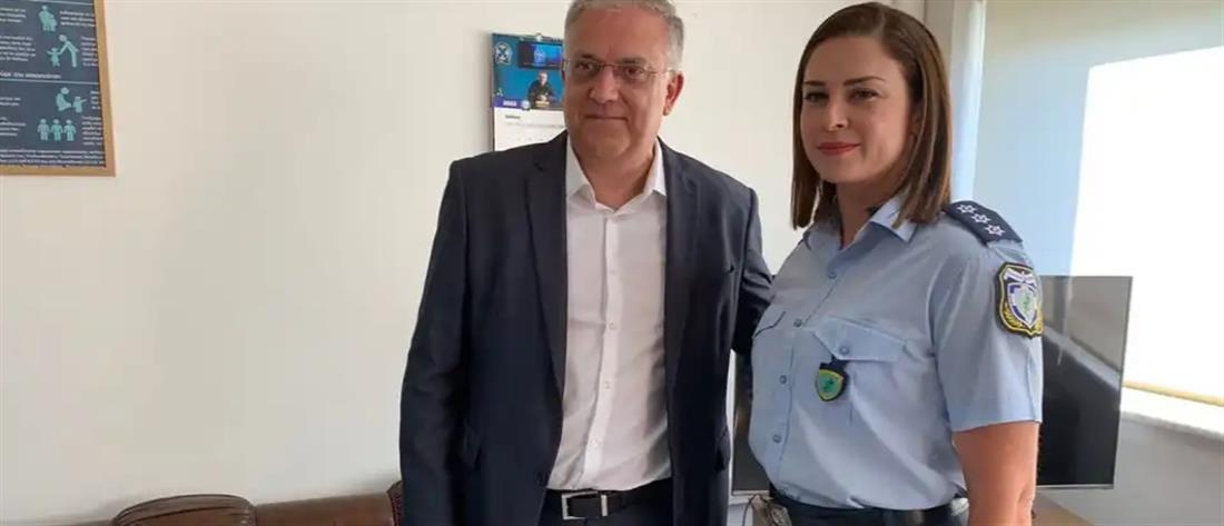 Κατά την επίσκεψη του στα Χανιά ο κ. Θεοδωρικάκος συναντήθηκε με την Αστυνόμο Β’ Μάρθα Κίτσιου η οποία την προηγούμενη Δευτέρα κάνοντας χρήση των γνώσεών της στις πρώτες βοήθειες έσωσε βρέφος που κινδύνεψε σε παραλία της πόλης.
