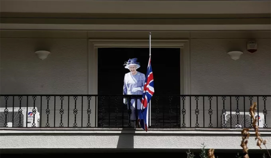 Μία φωτογραφία της εκλιπούσης Βασίλισσας Ελισάβετ σε φυσικό μέγεθος δίπλα σε μία μεσίστια βρετανική σημαία απαθανάτισε ο φωτογραφικός φακός όχι στο Ηνωμένο Βασίλειο αλλά σε μπαλκόνι στο κέντρο της Αθήνας.