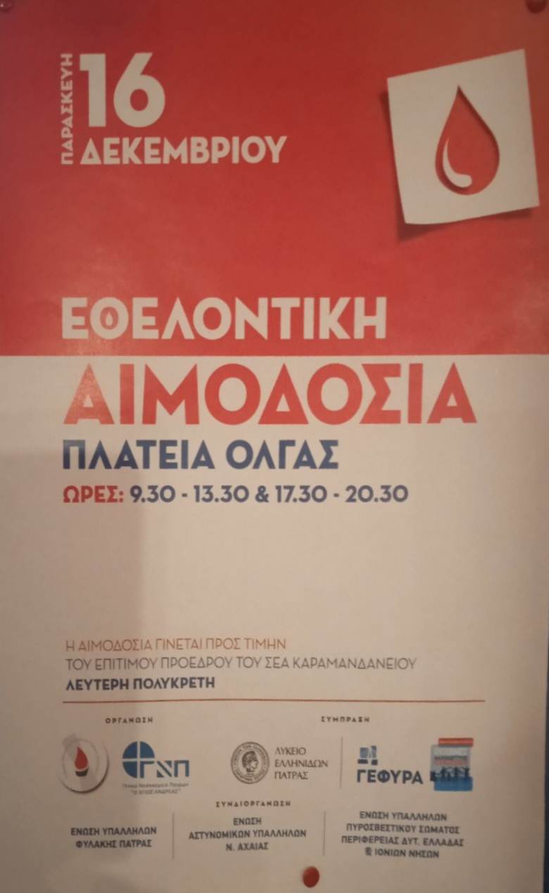 ΠΑΤΡΑ: Αιμοδοσία την Παρασκευή στην Πλ. Ολγας