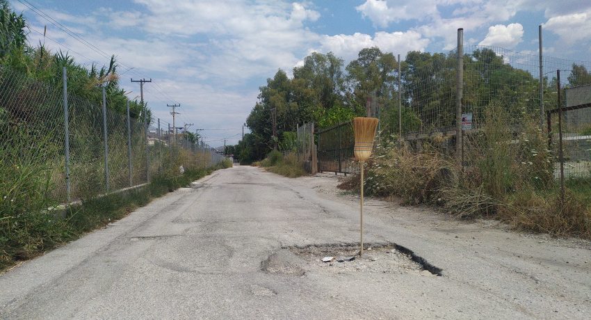 Σε μία από τις πολλές λακκούβες. Η σκούπα προφανώς έχει τον ρόλο πινακίδας σήμανσης για να προειδοποιήσει τους διερχόμενους οδηγούς και ειδικότερα τους δικυκλιστές για την παγίδα που υπάρχει στη μέση του δρόμου.