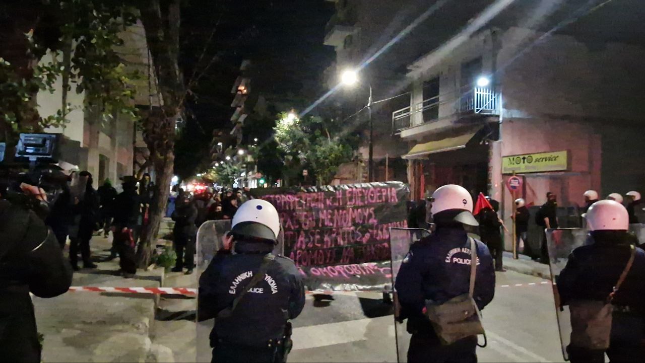 Στην οδό Παπαφλέσσα ήρθαν αντιμέτωποι με τα ΜΑΤ χωρίς ωστόσο να γίνουν επεισόδια. Σε ανακοίνωσή τους ανέφεραν: