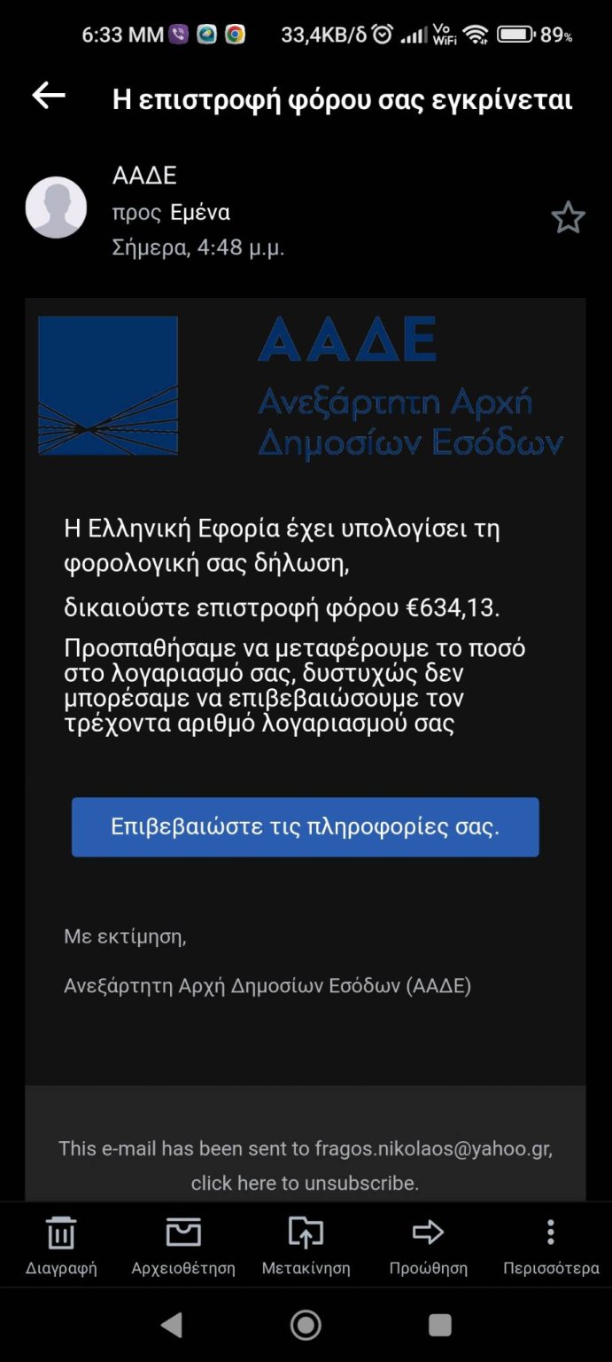 Γι’ αυτό η ΑΑΔΕ καλεί τους φορολογούμενους: να μην «πατάνε» το link, να μην ανοίγουν κανένα αρχείο που είναι συνημμένο και να διαγράψουν αμέσως το μήνυμα γιατί είναι πλαστό και περιέχει κακόβουλο λογισμικό.
