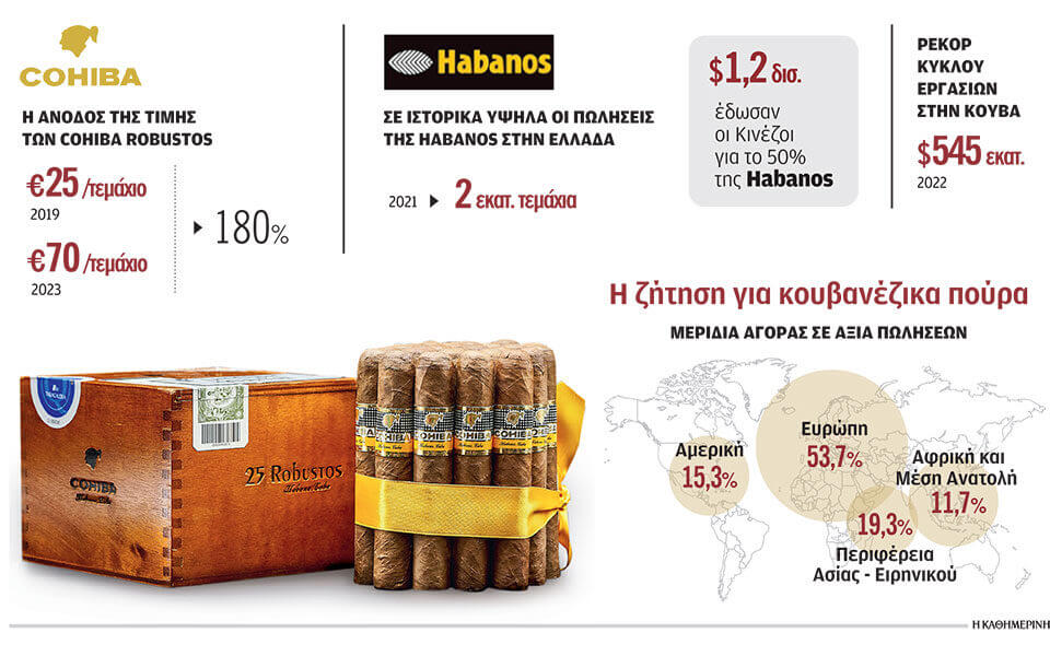 Το πιο χαρακτηριστικό από τα κουβανέζικα πούρα, το Cohiba Robustos, ένα από τα πιο δημοφιλή και περιζήτητα βίτολα της αγοράς, έχει γίνει δυσεύρετο. Και όπου είναι διαθέσιμο κοστίζει σήμερα κοντά στα 70 ευρώ το τεμάχιο από 25 ευρώ την περίοδο 2019-2020. Ολες οι διάσημες κουβανέζικες μάρκες, όπως τα Cohiba, τα Romeo y Julieta και τα Montecristo, όλα ιδιοκτησίας της κουβανέζικης καπνοβιομηχανίας Habanos S.A., το 50% της οποίας πέρασε τον Φεβρουάριο στην ιδιοκτησία κινεζικών συμφερόντων έναντι τιμήματος 1,2 δισ. δολαρίων, έχουν δει τις τιμές των πούρων τους να διπλασιάζονται ή και να τριπλασιάζονται. Κάποια από τα πιο μεγάλα πούρα όπως τα Churchill ξεπερνούν πια τα 120 ευρώ το κομμάτι. Αλλά ακόμα και σε αυτές τις τιμές υπάρχουν μεγάλες ελλείψεις. Ετσι, η κλασική στην αγορά κούτα των 25 πούρων Cohiba Robustos κοστίζει σήμερα 1.768,75 ευρώ, δηλαδή ακριβότερα από τα περισσότερα μοντέλα iPhone της Apple.