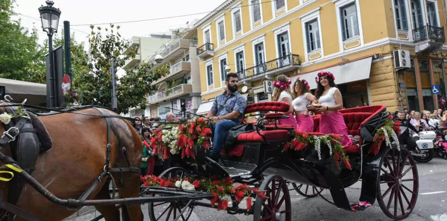 Πολύχρωμα άρματα, στολισμένα με λουλούδια και συνοδευόμενα από πεζοπόρα τμήματα και παιδιά γεμάτα κέφι και χαρά για τη ζωή, πλημμύρισαν το απόγευμα του περασμένου Σαββάτου την οδό Ερμού στη μεγάλη παρέλαση και «βούλιαξαν» την κεντρική πλατεία, όπου η Χορωδία της Ιθάκης ερμήνευσε καντάδες μιας άλλης εποχής.