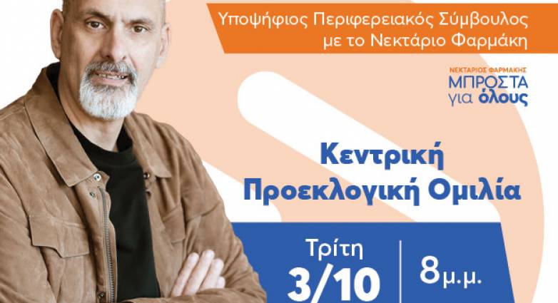 Σήμερα Τρίτη θα πραγματοποιήσει την κεντρική προεκλογική του συγκέντρωση ο Αντιπεριφερειάρχης Αχαΐας και εκ νέου υποψήφιος περιφερειακός σύμβουλος, με το συνδυασμό του Νεκτάριου Φαρμάκη, Χαράλαμπος Μπονάνος και μας προσκλαεί στο θέατρο ΡΟΑΓΙΑΛ για να ακούσουμε τον απολογισμό του έργου του, αλλά και για να τον ενισχύσουμε στην προσπάθεια του στις επικείμενες περιφερειακές εκλογές.