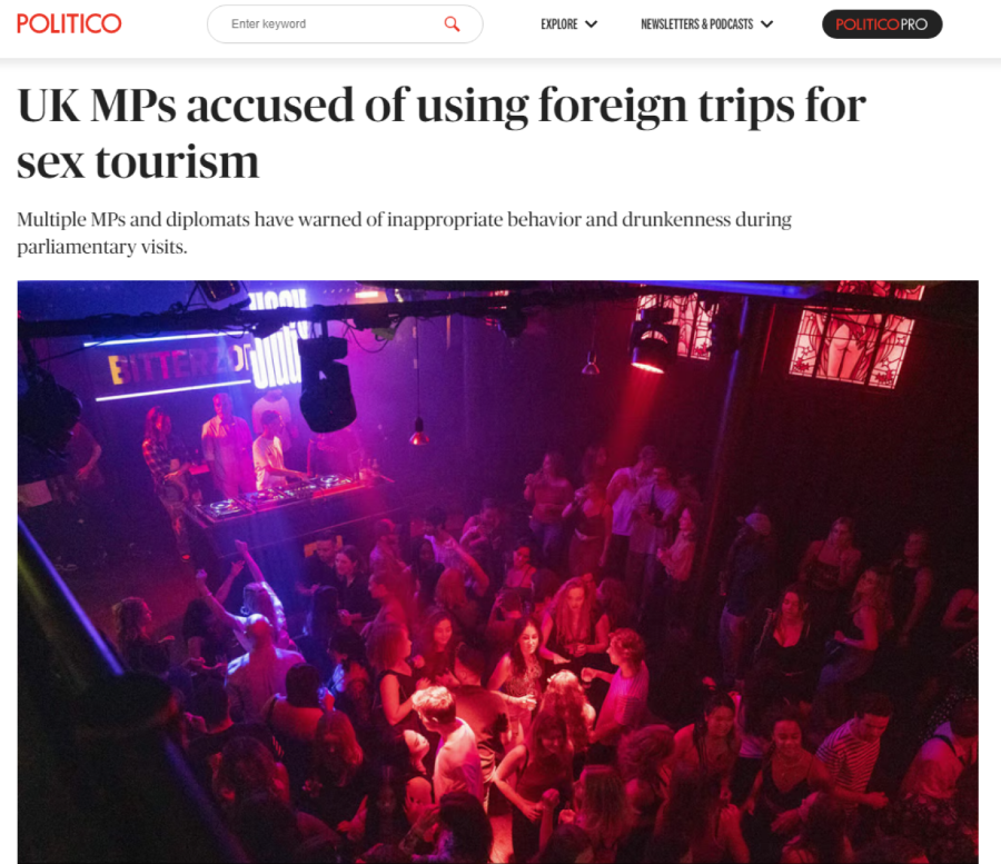 Ένας από τους βουλευτές, που πλέον είναι μέλος της Βουλής των Λόρδων, σε ταξίδι στη Νοτιοανατολική Ασία με κοινοβουλευτική ομάδα είχε ρωτήσει που είναι ο πλησιέστερος οίκος ανοχής. Άλλος ένας από τους Τόρις και πρώην υπουργός μάλιστα, έμενε ως αργά ψάχνοντας «ντόπιες γυναίκες» – και αν κρίνουμε από την μαρτυρία άλλου βουλευτή, αναζητούσε «πολύ νεαρά κορίτσια».