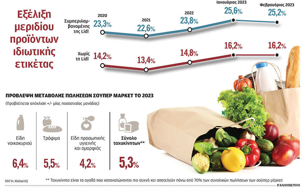 Σύμφωνα, λοιπόν, με στοιχεία που παρουσίασε χθες ο Αλέξανδρος Φλώρος, Retail Vertical Leader της εταιρείας για Ελλάδα και Βουλγαρία, ένα στα τέσσερα προϊόντα που ψωνίζουν πλέον από το σούπερ μάρκετ οι καταναλωτές στην Ελλάδα είναι ιδιωτικής ετικέτας. Συγκεκριμένα, ενώ το 2022 έκλεισε με το μερίδιο των προϊόντων αυτών να διαμορφώνεται σε 23,8% (συμπεριλαμβανομένων των πωλήσεων της Lidl, που αποτελεί τη βασική εκπτωτική αλυσίδα στην ελληνική αγορά), το πρώτο δίμηνο του 2023 το μερίδιο αγοράς των προϊόντων ιδιωτικής ετικέτας υπερβαίνει το 25%. Ακόμη και χωρίς να συμπεριληφθούν οι πωλήσεις της Lidl, το μερίδιο των προϊόντων ιδιωτικής ετικέτας είναι υψηλό, ήδη πάνω από μία ποσοστιαία μονάδα συγκριτικά με αυτό που διαμορφώθηκε το 2022: στο δίμηνο Ιανουαρίου – Φεβρουαρίου 2023 έφτασε το 16,2%, από 14,8% στο σύνολο της περυσινής χρονιάς και 13,4% το 2021.