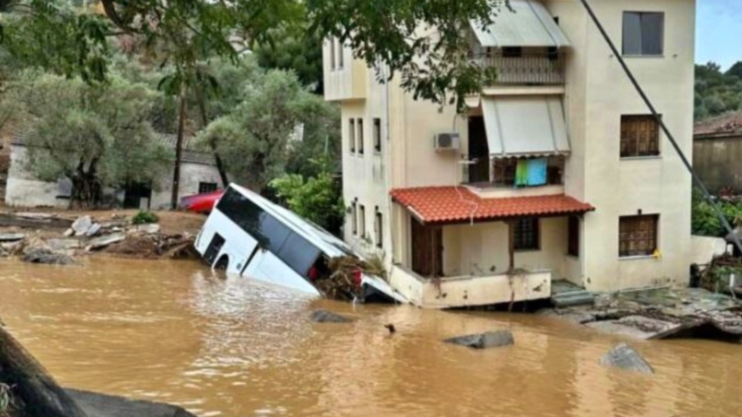 Στις φωτογραφίες, όπως μεταδίδει η ΕΡΤ, απεικονίζεται μία τριώροφη κατοικία να έχει πάρει κλίση και να «στηρίζεται» σε ένα τουριστικό λεωφορείο που παρασύρθηκε και βρέθηκε στην αυλή, ενώ ο δρόμος μπροστά από το σπίτι έχει διαλυθεί από τα ορμητικά νερά.