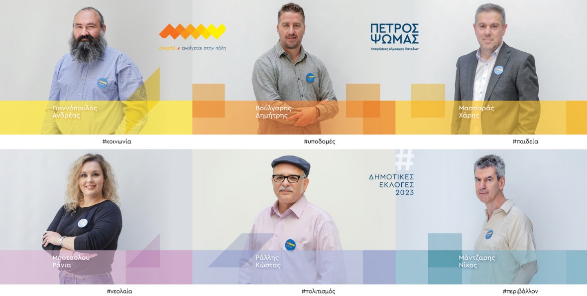 Ειδικότερα, στο ψηφοδέλτιο του σπιράλ εντάσσονται: ο μηχανολόγος μηχανικός Δημήτρης Βούλγαρης του Βασιλείου «για μια σύγχρονη βιώσιμη πόλη», ο Ανδρέας Γιαννόπουλος, συμβασιούχος δημοσίου, ο οποίος επιθυμεί «μια πόλη με περισσότερο πράσινο και κατοίκους περήφανους για αυτή», ο μεταφραστής Νικόλας Μάντζαρης για «ένα δήμο με επαγγελματική διοίκηση», ο εκπαιδευτικός Θεοχάρης Μασσαράς, ο οποίος πιστεύει στην ενεργή «συμμετοχή όλων των δημοτών», η λογίστρια Ράνια Μπότσολου για «μια Πάτρα πιο πράσινη και πιο οικολογική» και ο συντηρητής έργων τέχνης Κώστας Ράλλης για «να βρουν οι νέοι διέξοδο στις τέχνες».