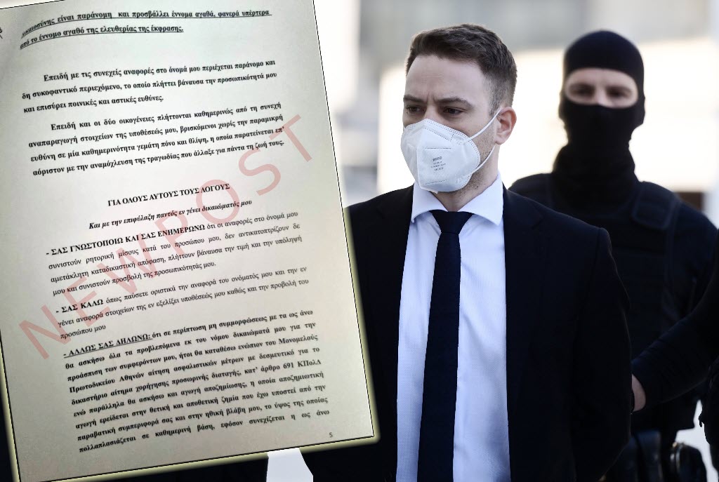 Ο δολοφόνος της Καρολάιν αναφέρει στο εξώδικό του που σας παρουσιάζει το Newpost ότι: «στο βωμό ενός τηλεοπτικού ρεπορτάζ κρίθηκα εντόνως και στοχοποιήθηκα τόσο εγώ όσο και ο φιλικός και οικογενειακός μου περίγυρος. Ακόμη και σήμερα όπου η υπόθεση βρίσκεται πλέον ενώπιον των αποκλειστικώς αρμοδίων, ήτοι των Δικαστικών Αρχών, καθημερινώς το όνομά μου αλλά και οι φωτογραφίες μου χρησιμοποιούνται εις μάτην από τους ελληνικούς τηλεοπτικούς σταθμούς και τον ηλεκτρονικό τύπο. Ακόμη και σήμερα ευρισκόμενος δεκαπέντε και πλέον μήνες υπό κράτηση και ενώ η Ελληνική Δικαιοσύνη δεν έχει αποφανθεί αμετακλήτως , καθώς εκκρεμεί η ασκηθείσα από εμέ Έφεση ενώπιον του Μικτού Ορκωτού Εφετείου Αθηνών, συνεχίζονται οι αναφορές στο πρόσωπό μου στην πλειοψηφία τους με ψευδές και συκοφαντικό περιεχόμενο που ουδεμία σχέση έχει με την ουσία της υπόθεσης. Πέραν των μυθευμάτων αυτών, εξυπακούεται ότι για την ασύστολη χρήση του ονόματός μου και την προβολή φωτογραφιών και βιντεοληπτικού υλικού δεν υπάρχει οποιαδήποτε συναίνεση οπότε και συνιστά παραβίαση των προσωπικών δεδομένων εμού και των οικείων μου.»