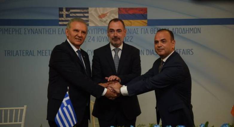 Με την υπογραφή Μνημονίου συναντίληψης και συνεργασίας στον τομέα της Διασποράς ολοκληρώθηκαν οι εργασίες της τριμερούς συνάντησης Ελλάδας, Κύπρου, Αρμενίας που πραγματοποιήθηκε στην Πάτρα το πρωί της Παρασκευής, 24 Ιουνίου 2022.