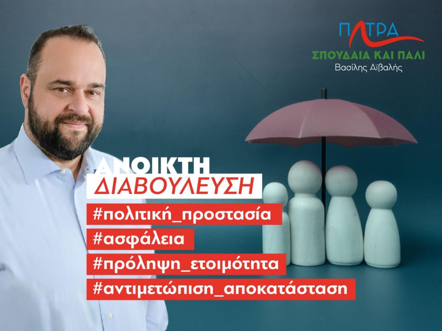 Με την ενότητα «Πολιτική Προστασία – Ασφάλεια» συνεχίζεται από σήμερα Τρίτη 1η Αυγούστου η δημόσια ηλεκτρονική διαβούλευση της παράταξης «Πάτρα, Σπουδαία και Πάλι» με επικεφαλής τον υποψήφιο δήμαρχο Πατρέων Βασίλη Αϊβαλή.